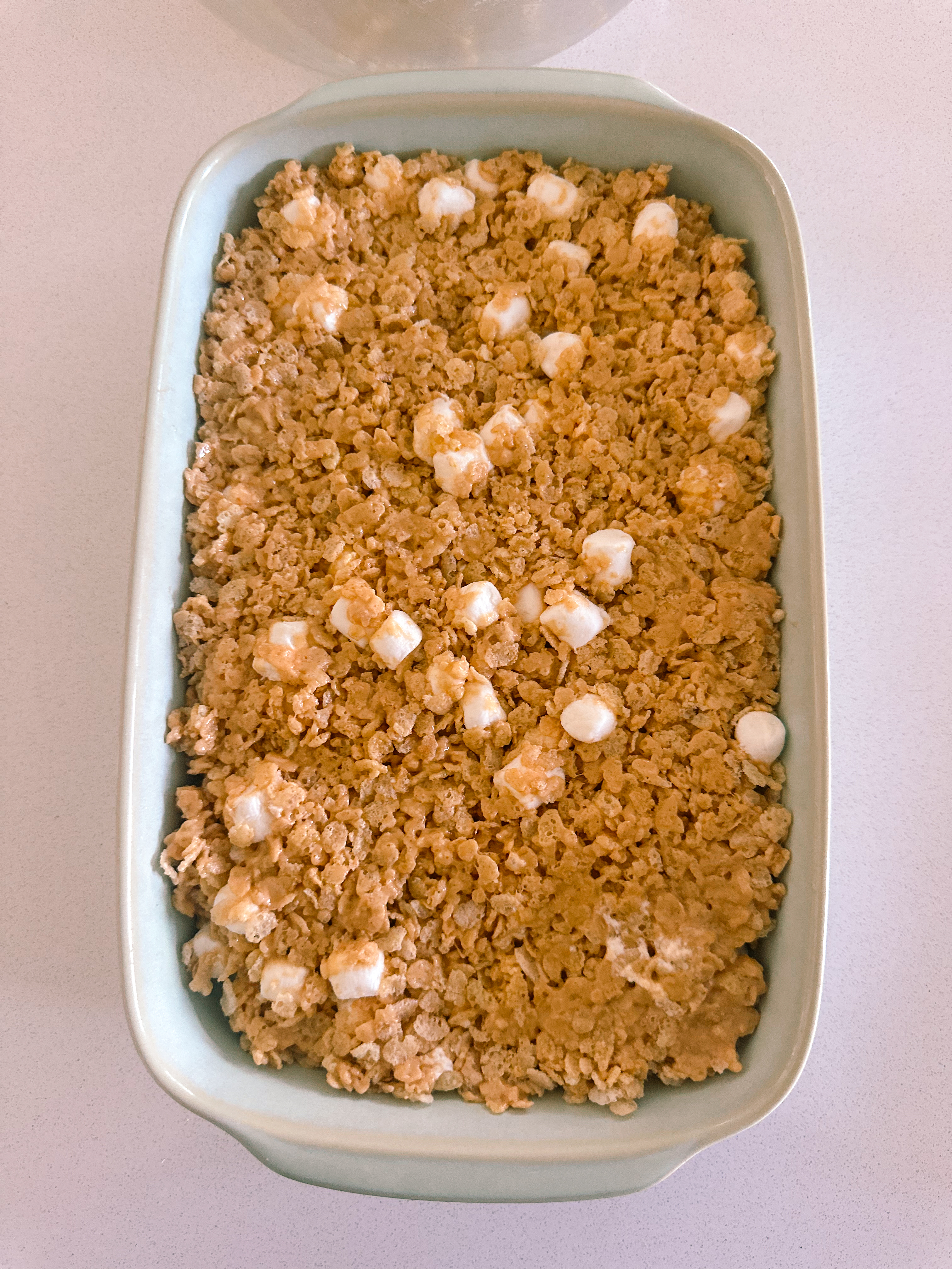 These were so easy to make and so good! They tasted like peanut butter fudge with Rice Krispies. They have three tablespoons of butter, 3/4 cup peanut butter, 2 1/2 cups mini marshmallows, and 4 cups of Rice Krispie cereal. We melted the butter and peanut butter together, folded in the marshmallows (had to melt those in the microwave for a few seconds), coated the Rice Krispie cereal, added a few extra marshmallows, transferred it all to a pan, and let them cool. SO EASY and such a treat!