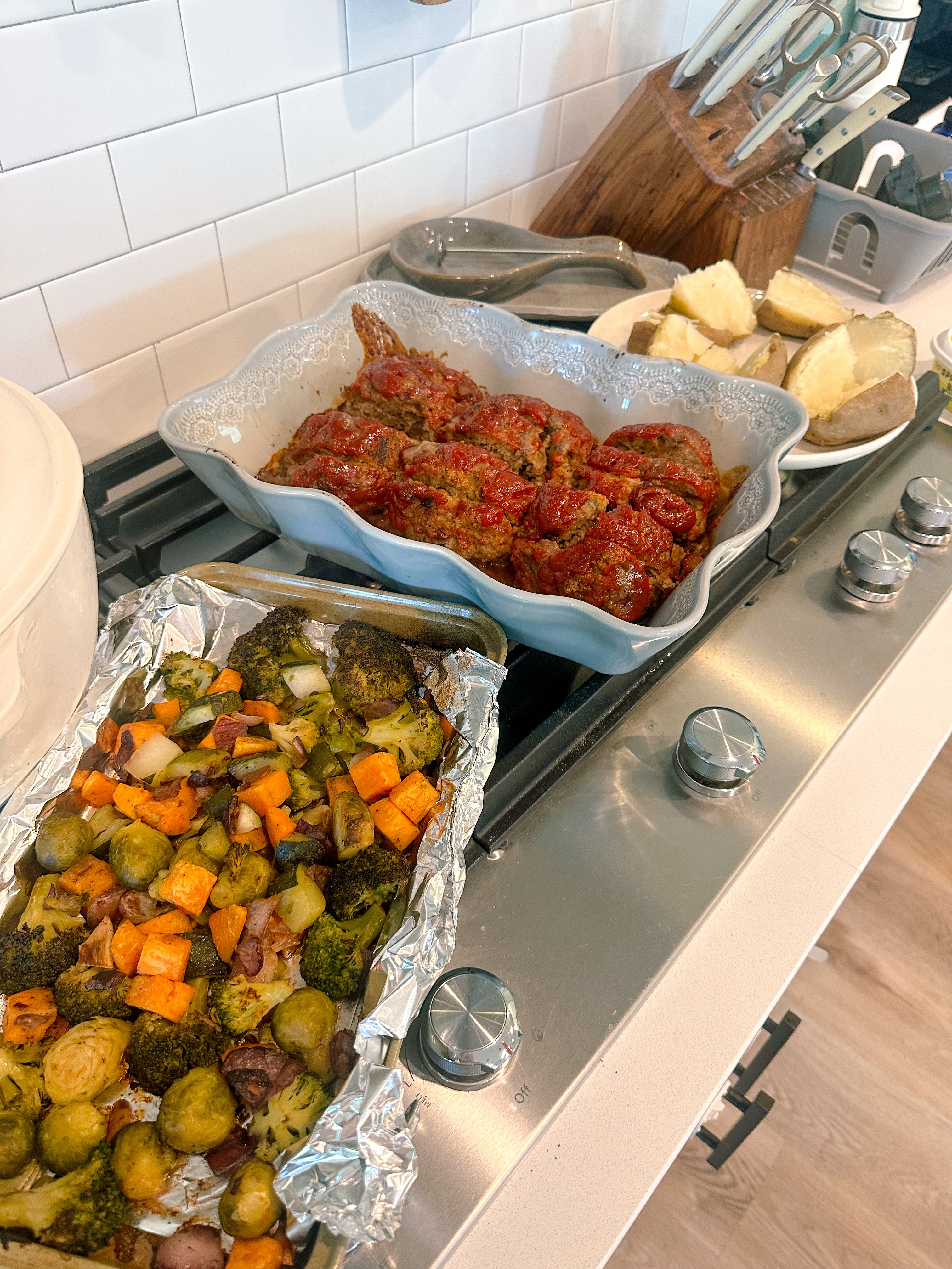 Friday night, we had a friend stop by who was in the area for dinner. I made their favorite, my turkey meatloaf recipe. I paired it with roasted vegetables and baked potatoes, and ended the evening with chocolate chip cookies.